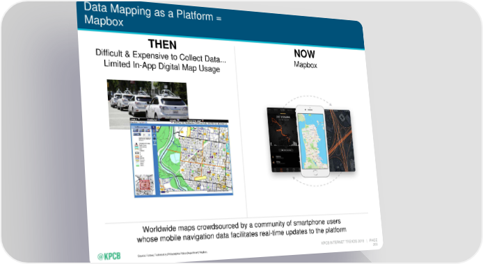 Data Mapping as a Platform = Mapbox THEN NOW Difficult & Expensive to Collect Data... Mapbox Limited In-App Digital Map Usage Worldwide maps crowdsourced by a community of smartphone users whose mobile navigation data facilitates real-time updates to the platform KPCB INTERNET TRENDS 2016 | PAGE Source: Forbes; Technical.ly; Philadelphia Police Department; Mapbox. 203