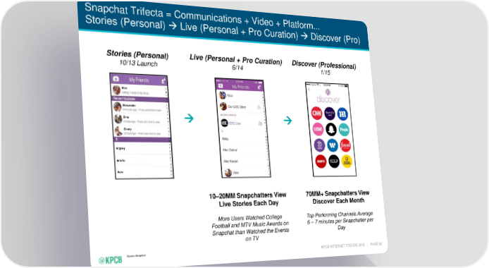 Snapchat Trifecta = Communications + Video + Platform... Stories (Personal) Live (Personal + Pro Curation) Discover (Pro) Stories (Personal) Live (Personal + Pro Curation) Discover (Professional) 10/13 Launch 6/14 1/15 Alex Alexander Dino Cindy Anjney Arielle Aviv 10–20MM Snapchatters View 70MM+ Snapchatters View Live Stories Each Day Discover Each Month More Users Watched College Top Performing Channels Average Football and MTV Music Awards on 6 – 7 minutes per Snapchatter per Snapchat than Watched the Events Day on TV Source: Snapchat KPCB INTERNET TRENDS 2016 | PAGE 80