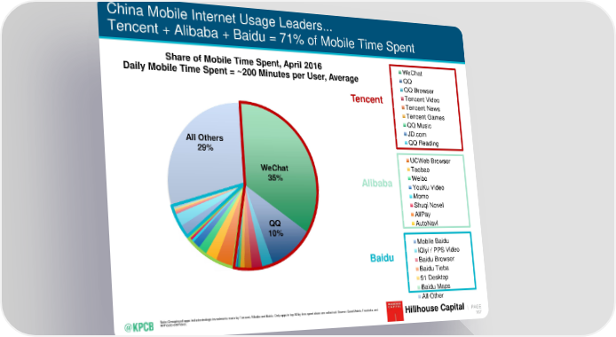 China Mobile Internet Usage Leaders... Tencent + Alibaba + Baidu = 71% of Mobile Time Spent Share of Mobile Time Spent, April 2016 WeChat Daily Mobile Time Spent = ~200 Minutes per User, Average QQ QQ Browser Tencent Tencent Video Tencent News Tencent Games QQ Music JD.com All Others QQ Reading 29% UCWeb Browser WeChat Taobao 35% Alibaba Weibo YouKu Video Momo Shuqi Novel QQ AliPay 10% AutoNavi Mobile Baidu Baidu iQiyi / PPS Video Baidu Browser Baidu Tieba 91 Desktop Baidu Maps All Other Note: Grouping of apps include strategic investments made by Tencent, Alibaba and Baidu. Only apps in top 50 by time spent share are called out. Source: QuestMobile, Trustdata, and Hillhouse estimates. KPCB INTERNET TRENDS 2016 | PAGE Hillhouse Capital 167