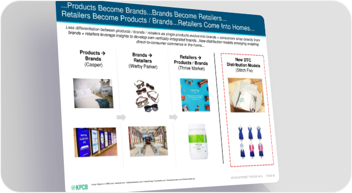 ...Products Become Brands...Brands Become Retailers... Retailers Become Products / Brands...Retailers Come Into Homes... Less differentiation between products / brands / retailers as single products evolve into brands + consumers shop directly from brands + retailers leverage insights to develop own vertically-integrated brands...New distribution models emerging enabling direct-to-consumer commerce in the home... Brands Retailers New DTC Products Brands Retailers Products / Brands Distribution Models (Casper) (Warby Parker) (Thrive Market) (Stitch Fix) Image: Myjane.ru, CNBC.com, Vanityfair.com, Insidebusinessnyc.com, Funandfit.org, Thrivemarket.com, Thedustyrosestyle.com, Stitchfix.tumblr.com KPCB INTERNET TRENDS 2016 | PAGE 63