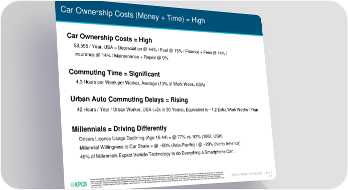 Car Ownership Costs (Money + Time) = High Car Ownership Costs = High $8,558 / Year, USA = Depreciation @ 44% / Fuel @ 15% / Finance + Fees @ 14% / Insurance @ 14% / Maintenance + Repair @ 9% Commuting Time = Significant 4.3 Hours per Week per Worker, Average (13% of Work Week, USA) Urban Auto Commuting Delays = Rising 42 Hours / Year / Urban Worker, USA (+2x in 30 Years), Equivalent to ~1.2 Extra Work Weeks / Year Millennials = Driving Differently Drivers License Usage Declining (Age 16-44) = @ 77% vs. 92% (1982, USA) Millennial Willingness to Car Share = @ ~50% (Asia-Pacific) / @ ~20% (North America) 46% of Millennials Expect Vehicle Technology to do Everything a Smartphone Can... Source: Ownership costs per AAA (4/16); Vehicle fees include license, taxes and registration. Commuting times per U.S. Census Bureau (2013) and include all transport options apart from walking and biking. Average USA work week per OECD Employment Outlook (7/15). Urban auto commuting delays per Texas A&M Transportation Institute / INRIX 2015 Mobility Scorecard (8/15); delays defined as extra time spent during the year traveling at congested rather than free-flow speeds by private vehicle drivers / passengers for 471 US urban areas. Driver’s license rates per University of Michigan KPCB INTERNET TRENDS 2016 | PAGE Transportation Research Institute / Federal Highway Administration (1/16). Car sharing statistics per Goldman Sachs Research (5/15). Millennial expectations per AutoTrader 2016 Cartech Impact Study 153 (9/15, n=1,012).