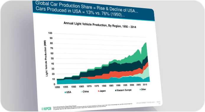 Global Car Production Share = Rise & Decline of USA... Cars Produced in USA = 13% vs. 76% (1950)... Annual Light Vehicle Production, By Region, 1950 – 2014 100 90 ) M 80 M ( on 70 i t 60 oduc r 50 P e l c 40 hi e V 30 ght 20 Li 10 0 1950 1955 1960 1965 1970 1975 1980 1985 1990 1995 2000 2005 2010 USA China Japan Western Europe Other Source: Wards Automotive, Morgan Stanley Research Note: Production measure represents all light vehicles manufactured within the given region (regardless of OEM home country). Light vehicles include passenger cars, sport utility vehicles and light trucks KPCB INTERNET TRENDS 2016 | PAGE (e.g. pickups). Data from 1950-1985 only available every 5 years. Largest “Other” constituents are South Korea, India and Mexico. 144