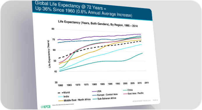 Global Life Expectancy @ 72 Years = Up 36% Since 1960 (0.6% Annual Average Increase) Life Expectancy (Years, Both Genders), By Region, 1960 – 2014 80 70 s) ear Y ( 60 cy an ect xp 50 e E f i L 40 30 1960 1965 1970 1975 1980 1985 1990 1995 2000 2005 2010 2014 World USA China India Europe / Central Asia East Asia / Pacific Middle East / North Africa Sub-Saharan Africa Source: World Bank World Development Indicators KPCB INTERNET TRENDS 2016 | PAGE 36