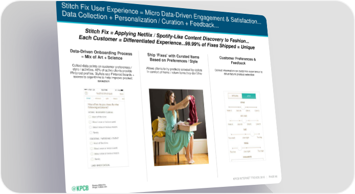 Stitch Fix User Experience = Micro Data-Driven Engagement & Satisfaction... Data Collection + Personalization / Curation + Feedback... Stitch Fix = Applying Netflix / Spotify-Like Content Discovery to Fashion... Each Customer = Differentiated Experience...99.99% of Fixes Shipped = Unique Data-Driven Onboarding Process Ship ‘Fixes’ with Curated Items Customer Preferences & = Mix of Art + Science Based on Preferences / Style Feedback Collect data points on customer preferences / Allows clients to try products selected by stylists Collect information on customer experience to style / activities. 46% of active clients provide in comfort of home / return items they don’t like drive future product selection Pinterest profiles. Stylists use Pinterest boards + access to algorithms to help improve product selection Source: Stitch Fix Image: Forbes.com KPCB INTERNET TRENDS 2016 | PAGE 68