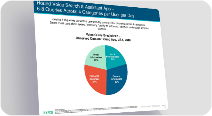 Hound Voice Search & Assistant App = 6-8 Queries Across 4 Categories per User per Day Seeing 6-8 queries per active user per day among 100+ domains across 4 categories... Users most care about speed / accuracy / ability to follow up / ability to understand complex queries... Voice Query Breakdown – Observed Data on Hound App, USA, 2016 Local Fun & Information Entertainment 22% 21% Personal General Assistant Information 27% 30% Source: SoundHound Note: Based on most recent 30-days of user activity. Local information refers to queries about weather, restaurants, hotels, maps and navigation. Fun & entertainment refers to queries about music, movies, games, etc. General information refers to queries about facts, dictionary, sports, stocks, mortgages, nutrition, etc. Personal assistant refers to queries and commands about phone / communications, Uber KPCB INTERNET TRENDS 2016 | PAGE and transportation, flight status, calendars, timers, alarms, etc. 124