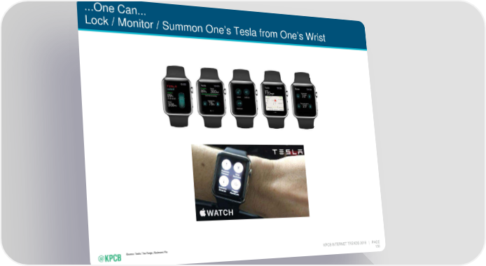 Mary Meeker's Annual Internet Trends Report Page 136 Page 138...One Can... Lock / Monitor / Summon One’s Tesla from One’s Wrist Source: Tesla, The Verge, Redmond Pie KPCB INTERNET TRENDS 2016 | PAGE 136