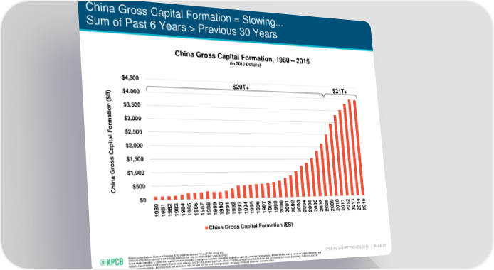China Gross Capital Formation = Slowing... Sum of Past 6 Years > Previous 30 Years China Gross Capital Formation, 1980 – 2015 (In 2010 Dollars) $4,500 $20T+ $21T+ ) $4,000 B $ ( $3,500 on i t a $3,000 m For $2,500 l a t pi $2,000 a C s $1,500 os r $1,000 G na hi $500 C $0 80 81 82 83 84 85 86 87 88 89 90 91 92 93 94 95 96 97 98 99 00 01 02 03 04 05 06 07 08 09 10 11 12 13 14 15 19 19 19 19 19 19 19 19 19 19 19 19 19 19 19 19 19 19 19 19 20 20 20 20 20 20 20 20 20 20 20 20 20 20 20 20 China Gross Capital Formation ($B) Source: China National Bureau of Statistics, 5/16. Assumes constant FX rate RMB/USD @ 6.5. Amounts are inflation adjusted to 2010 dollars based on IMF data on inflation rates (yearly average). KPCB INTERNET TRENDS 2016 | PAGE 24 Gross capital formation = gross fixed capital formation (majority) + changes in inventory. Gross fixed capital formation includes land improvements (fences, ditches, drains, and so on); plant, machinery, and equipment purchases; and the construction of roads, railways, and the like, including schools, offices, hospitals, private residential dwellings, and commercial and industrial buildings. It also includes the value of draught animals, breeding stock and animals for milk, for wool and for recreational purposes, and newly increased forest with economic value.