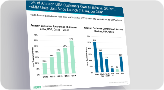 ~5% of Amazon USA Customers Own an Echo vs. 2% Y/Y... ~4MM Units Sold Since Launch (11/14), per CIRP ~4MM Amazon Echo devices have been sold in USA as of 3/16, with ~1MM sold in Q1:16, per CIRP estimates Amazon Customer Awareness of Amazon Amazon Customer Ownership of Amazon Echo, USA, Q1:15 – Q1:16 Devices, USA, Q1:16 70% 60% 61% 51% 60% 50% 50% 47% 40% ase 40% ase 34% B40% B er er30% 26% m 30% m o 30% o 22% st st u 20% u 20% C C f 20% f o o % % 10% 10% 6% 5% 0% 0% Q1:15 Q2:15 Q3:15 Q4:15 Q1:16 Prime Kindle Kindle Fire Echo None Fire Reader TV Source: Consumer Intelligence Research Partners (CIRP) Note: Amazon Echo limited launch occurred in 11/14 and wide-release occurred in 6/15. KPCB INTERNET TRENDS 2016 | PAGE 131