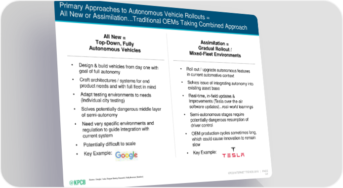Primary Approaches to Autonomous Vehicle Rollouts = All New or Assimilation...Traditional OEMs Taking Combined Approach All New = Assimilation = Top-Down, Fully Gradual Rollout / Autonomous Vehicles Mixed-Fleet Environments • Design & build vehicles from day one with • Roll out / upgrade autonomous features goal of full autonomy in current automotive context • Craft architectures / systems for end • Solves issue of integrating autonomy into product needs and with full fleet in mind existing asset base • Adapt testing environments to needs • Real-time, in-field updates & (individual city testing) improvements (Tesla over-the-air • Solves potentially dangerous middle layer software updates)...real-world learnings of semi-autonomy • Semi-autonomous stages require • Need very specific environments and potentially dangerous resumption of regulation to guide integration with driver control current system • OEM production cycles sometimes long, • Potentially difficult to scale which could cause innovation to remain slow • Key Example: • Key Example: Source: Google, Tesla, Morgan Stanley Research, Reilly Brennan (Stanford) KPCB INTERNET TRENDS 2016 | PAGE 141