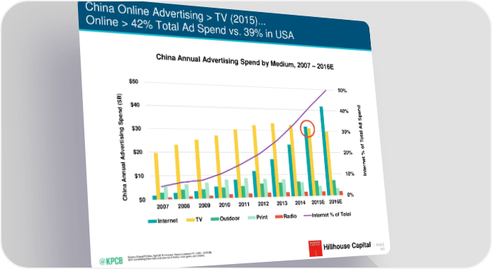 China Online Advertising > TV (2015)... Online > 42% Total Ad Spend vs. 39% in USA China Annual Advertising Spend by Medium, 2007 – 2016E $50 50% ) B $ $40 40% nd nd ( pe S pe d S A $30 30% l ng a i ot s T i t r of e $20 20% dv % A t l ne r e nnua $10 10% nt A I na hi C $0 0% 2007 2008 2009 2010 2011 2012 2013 2014 2015E 2016E Internet TV Outdoor Print Radio Internet % of Total Source: GroupM China, April 2016 Forecast. Assume constant FX 1USD = 6.5RMB. USA advertising share data excludes out-of-home, video game, and cinema. KPCB INTERNET TRENDS 2016 | PAGE Hillhouse Capital 169