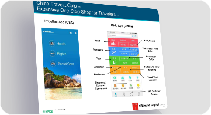 China Travel...Ctrip = Expansive One-Stop-Shop for Travelers... Priceline App (USA) Ctrip App (China) Hotel B&B, Hostel Transport Train / Bus / Ferry Ticket Destination Tour Guide Attraction Portable Wi-Fi for Roaming Restaurant Travel Visa / Shopping / Insurance Currency Conversion 24/7 Customer Service Source: Priceline, Ctrip. KPCB INTERNET TRENDS 2016 | PAGE Hillhouse Capital 173