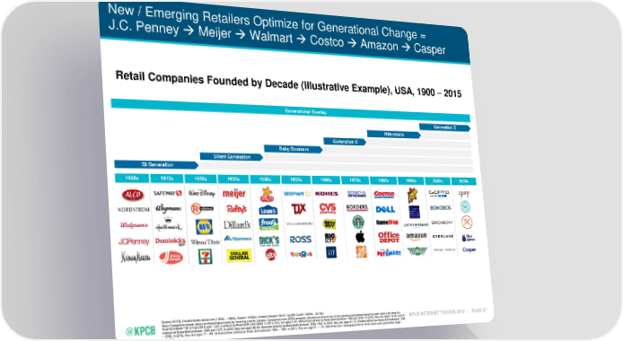 New / Emerging Retailers Optimize for Generational Change = J.C. Penney Meijer Walmart Costco Amazon Casper Retail Companies Founded by Decade (Illustrative Example), USA, 1900 – 2015 Generational Overlap Generation Z Millennials Generation X Baby Boomers Silent Generation GI Generation 1900s 1910s 1920s 1930s 1940s 1950s 1960s 1970s 1980s 1990s 2000s 2010s ` Source: KPCB, Retailindustry.about.com (1900s – 1980s), Ranker (1990s), Internet Retailer “2016 Top 500 Guide” (2000s – 2010s) Note: Companies shown above in chronological order by founding year by decade. Companies from 2000s onwards selected as diverse set of fast-growing companies based on web sales data from the Internet Retailer “2016 Top 500 Guide.” Gen Z defined as those born after 2000. In 2015, they are ages 0-15. Millennials defined as those born between 1980 and 2000. In 2015, they are ages 15-35. Gen X KPCB INTERNET TRENDS 2016 | PAGE 57 defined as those born between 1965 and 1979. In 2015, they are ages 36-50. Boomers defined as those born between 1946-1964. In 2015, they are ages 51-70. Silents defined as those born between 1925 – 1945. In 2015, they are ages 71 – 90. GI Generation defined as those born between 1900 – 1924. In 2015, they are age 91 – 115. Note there are varying opinions on what years each generation begin and end.